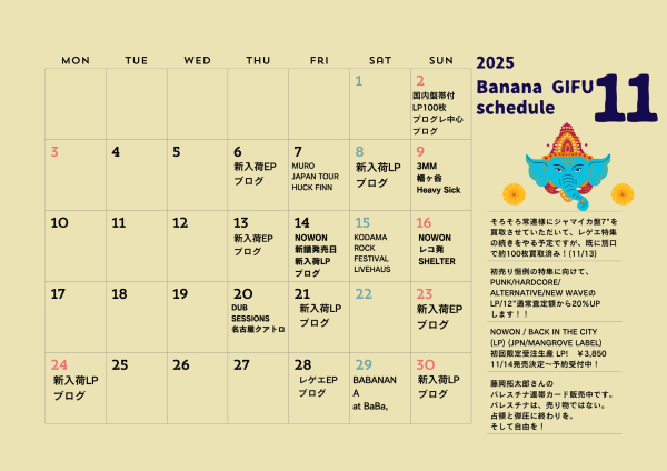 特集やブログ更新日&入荷情報などは、月間スケジュールをご確認いただけると幸いです。